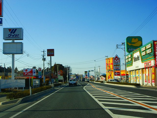 国道115号バイパスと県道74号が交差する中野交差点の手前には大型SCショッピングタウンベガがあり、その周辺の沿線には郊外型量販店群が建ち並びます。