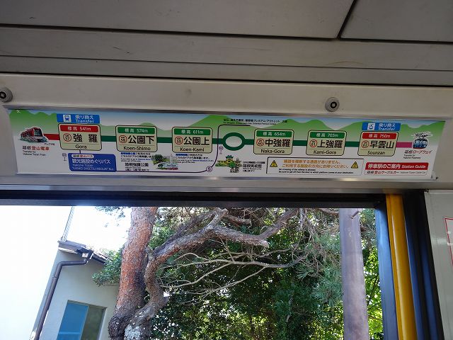 | 箱根登山ケーブルカー(強羅〜早雲山) (2016年10月15日撮影) DSC-HX30V 箱根登山ケーブルカーは箱根登山電車と接続する標高541mの強羅駅から箱根ロープウェイに接続する標高750mの早雲山駅との間を直線で坂を上っていく路線です。 強羅駅でケーブルカーに乗車します ![]() 強羅駅は標高541m ![]() ![]() ケーブルカー車内も階段状になっています ![]() ![]() 箱根登山ケーブルカー路線図 ![]() 早雲山へ向け出発 ![]() まもなく早雲山駅 ![]() ![]() ![]() 早雲山駅は標高750m ![]() ここでロープウェイに乗りかえ大涌谷へ向かいます ![]() NEXT