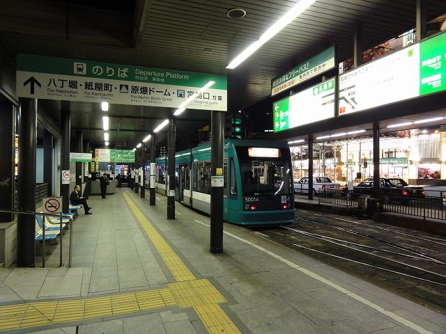 広島市街方面への出口は南口の方で、中心部の紙屋町や原爆ドーム、宮島口、広島港など各方面へ向けて広島電鉄の路面電車がひっきりなしに発着しています。