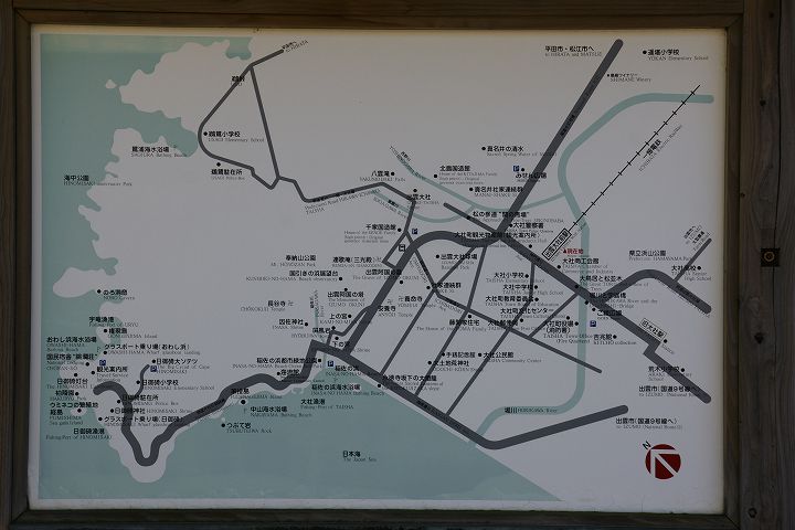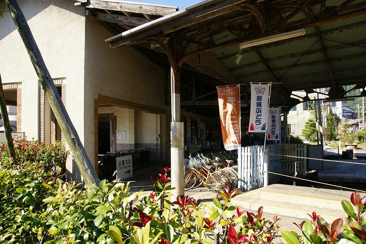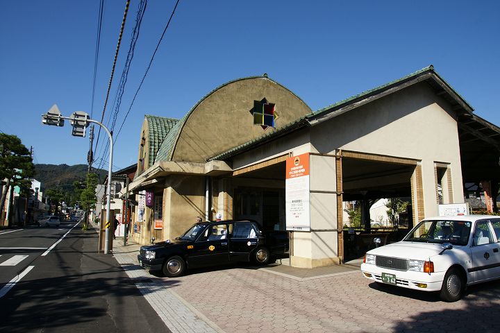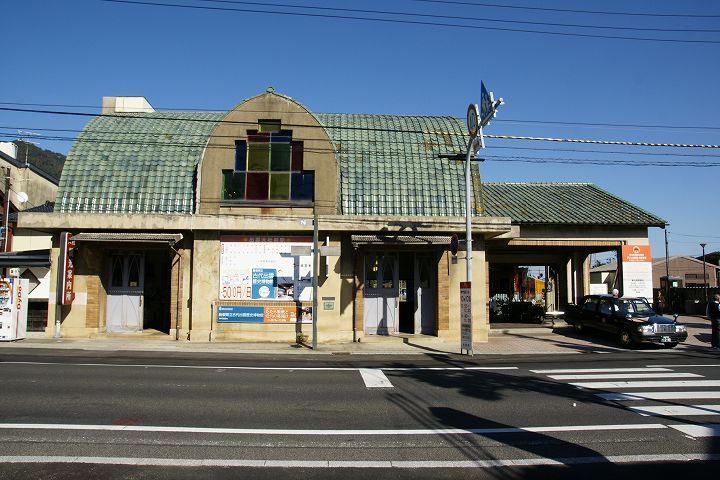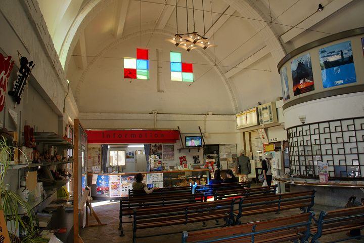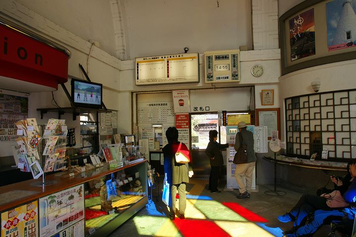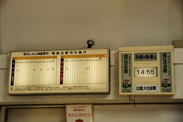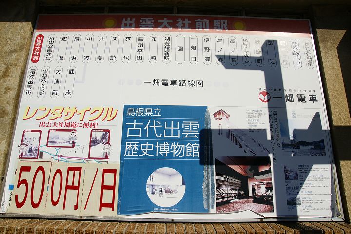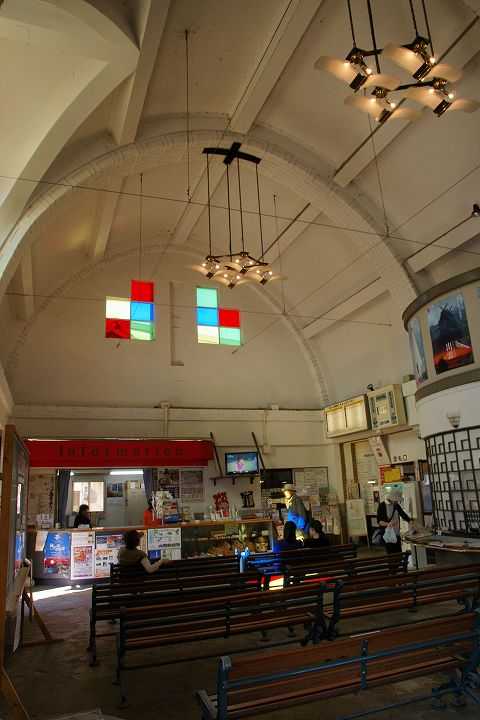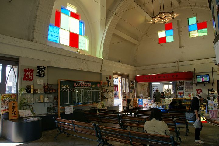 出雲大社前駅 (2011年10月4日撮影) DSC-A700 一畑電鉄の出雲大社前駅はレトロチックなステンドグラスのある教会風な駅舎が特徴的です。 この駅からは松江しんじ湖温泉方面へ電車が走っています。 大きな地図で見る 一見駅とは思えない雰囲気 駅舎内はステンドグラスがあり教会チックな雰囲気 発車時刻表 ホームの様子 一畑電車路線図 出雲大社前駅から出雲大社、日御碕方面案内図 出雲大社まであと少し NEXT