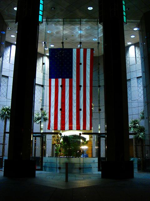 セブンスフィグ南側ビルのエントランスに掲げられた星条旗