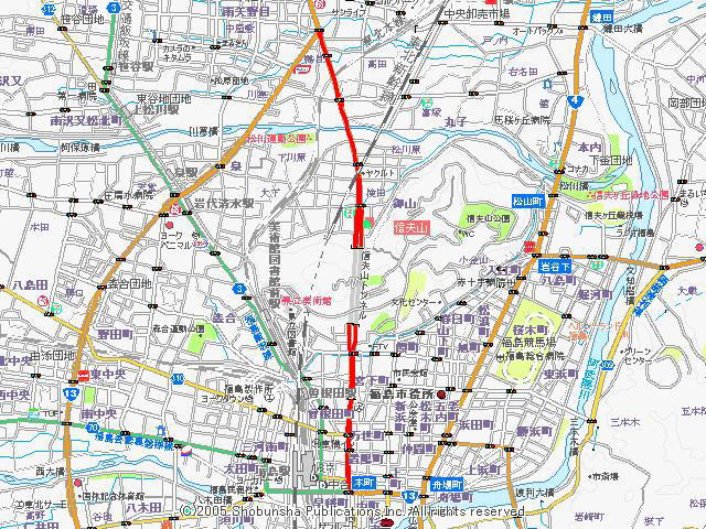 国道13号福島西道路分岐点から国道13号を南進します。福島サティ入口を過ぎると東北本線を跨ぎ国道4号・飯坂街道と接続する福商通りと交差します。その先松川を渡り東北新幹線と交差、さらに信夫山トンネルをくぐり抜け福島市中心部に入って行きます。