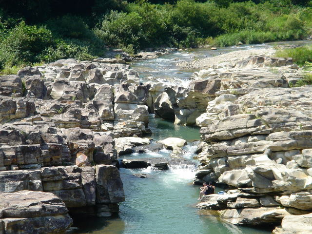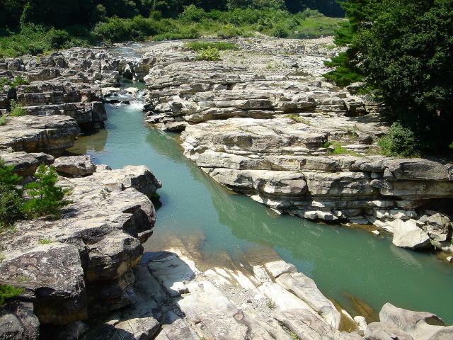 橋上から見た摺上川の岩肌