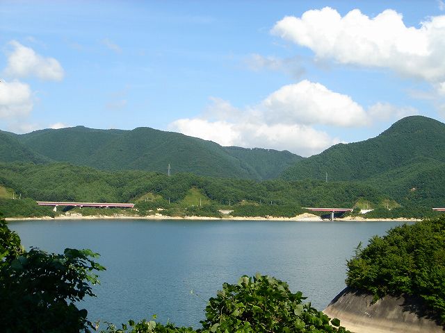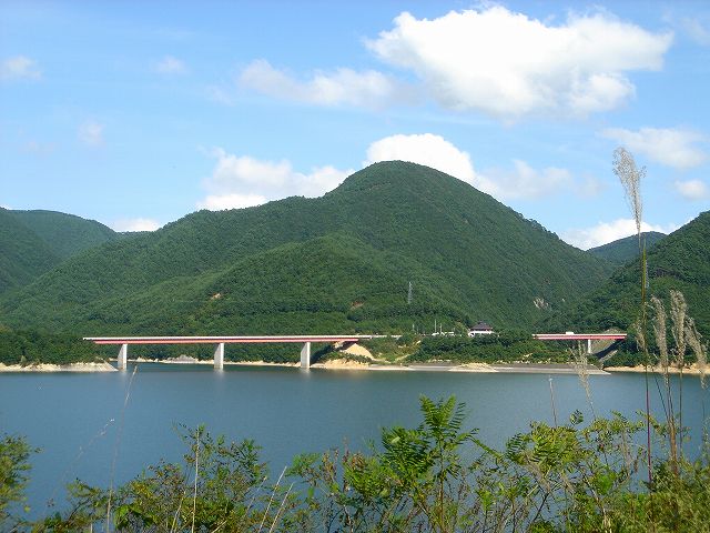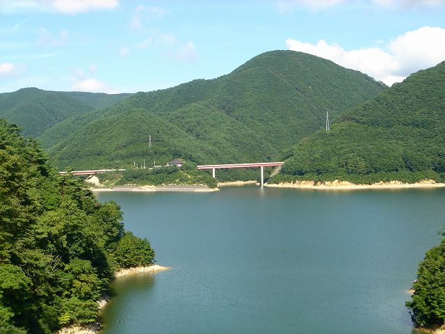 ところどころの沢に架かる橋からは七ヶ宿湖が広がり、ダム湖の美しい風景が続きます。