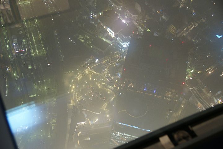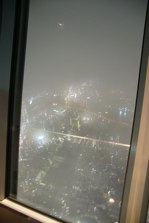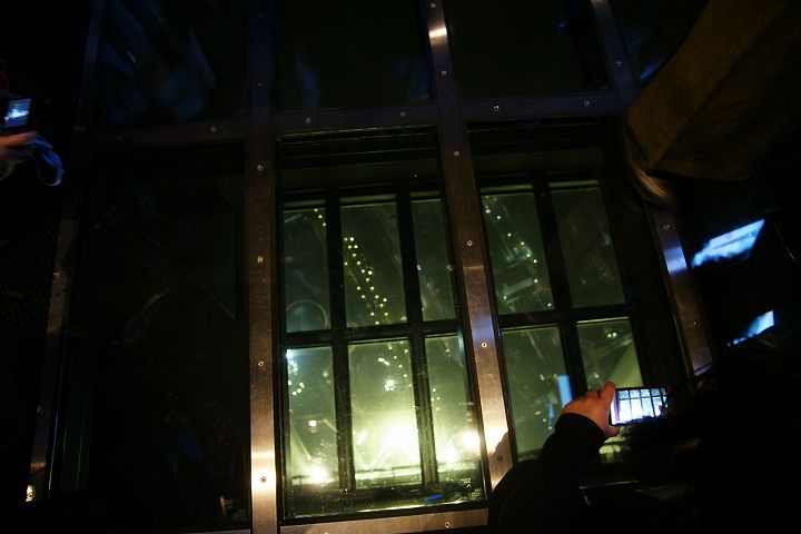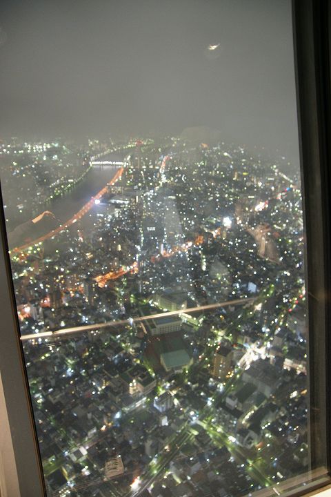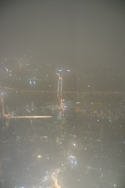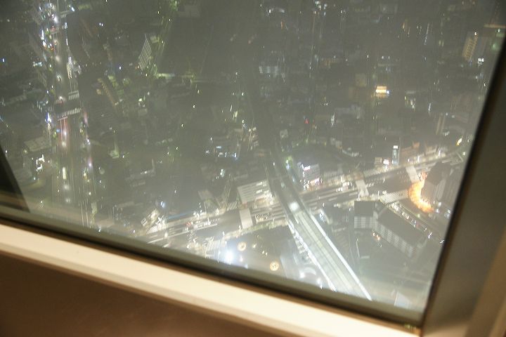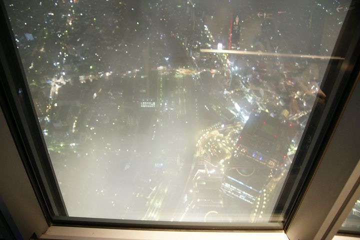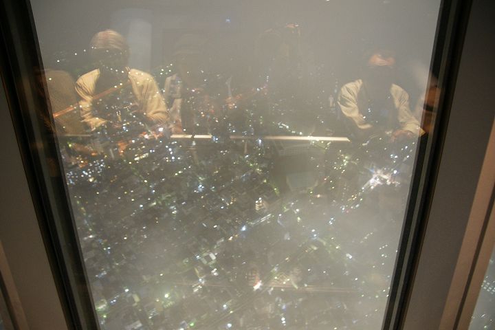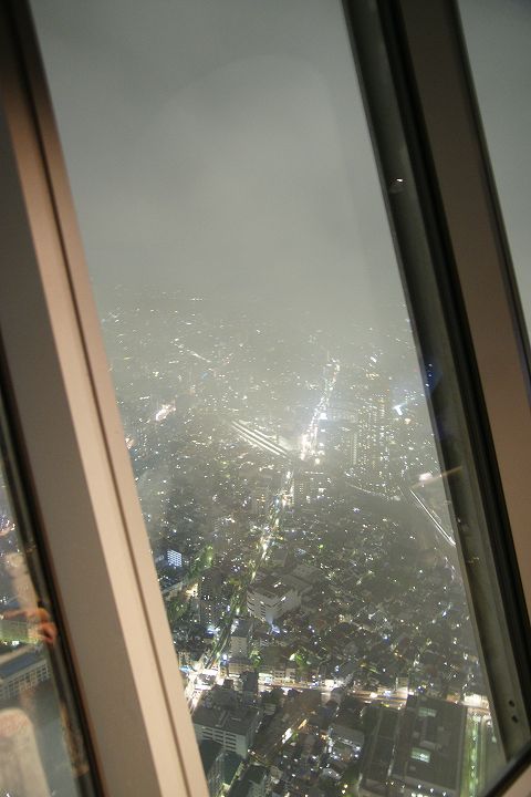 東京スカイツリー天望回廊フロア445-450でライトアップの時刻を迎えました。だけど相変わらず雲の中の世界なので諦めてエレベーターで天望デッキフロア340へ。ここからだと何とか流れていく雲の切れ間から夜景を見ることができました。雲が切れきれいな夜景が覗いた瞬間、周囲が歓声を上げるのが面白かった。せっかく高い金払って来たのに何も見えなくちゃ面白くないからね。で、最後のガラス床。ここからはスカイツリーの根元が結構よく見えたのでよかった。高所なんだけどあまり怖さを感じなかったな。