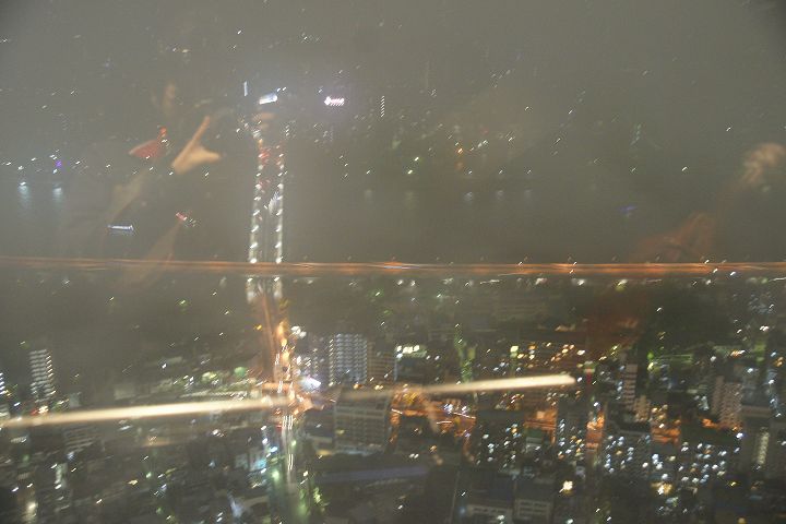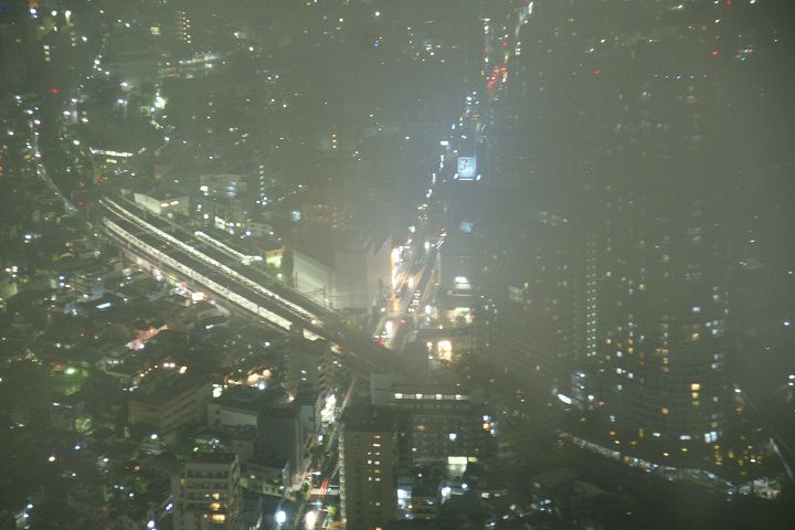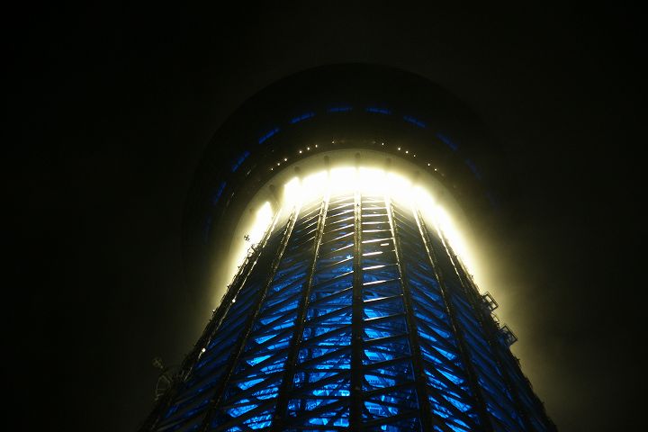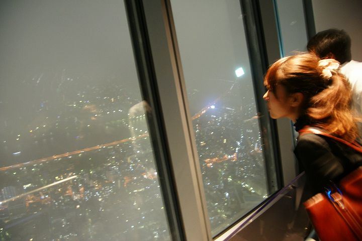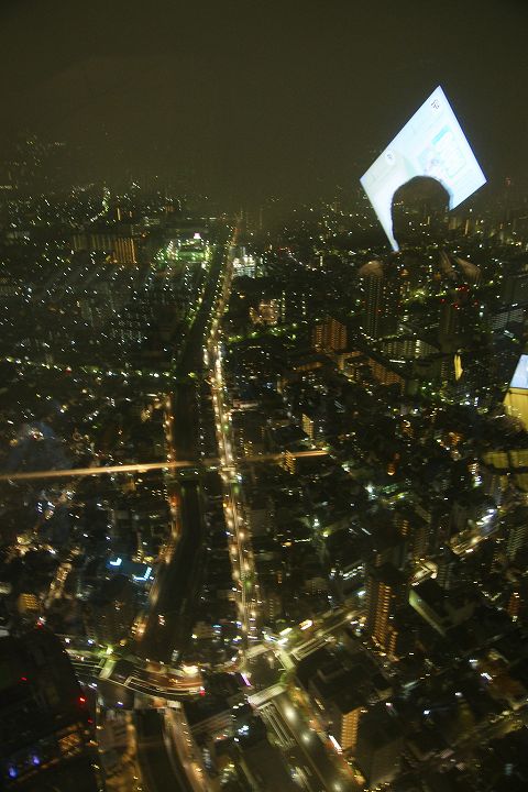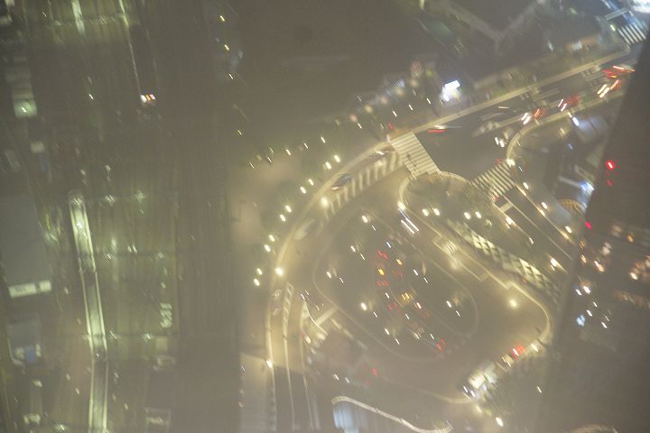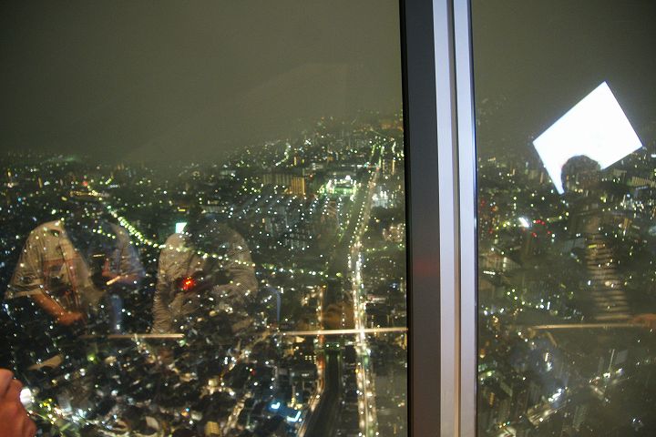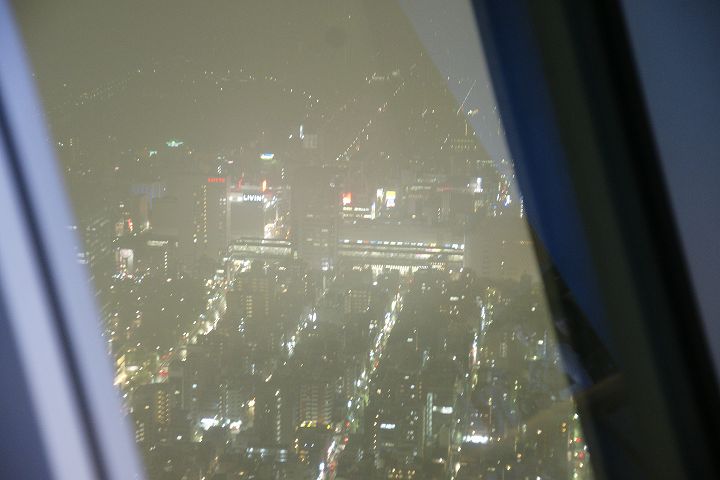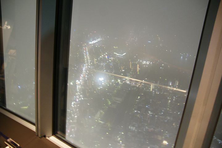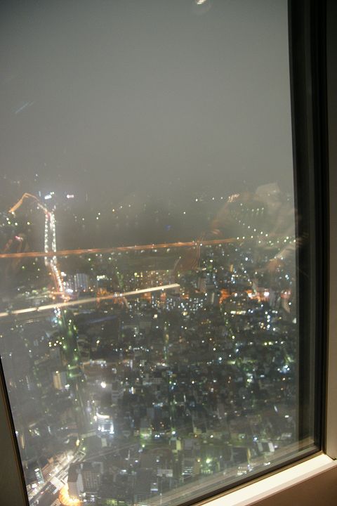 東京スカイツリー天望回廊フロア445-450でライトアップの時刻を迎えました。だけど相変わらず雲の中の世界なので諦めてエレベーターで天望デッキフロア340へ。ここからだと何とか流れていく雲の切れ間から夜景を見ることができました。雲が切れきれいな夜景が覗いた瞬間、周囲が歓声を上げるのが面白かった。せっかく高い金払って来たのに何も見えなくちゃ面白くないからね。で、最後のガラス床。ここからはスカイツリーの根元が結構よく見えたのでよかった。高所なんだけどあまり怖さを感じなかったな。