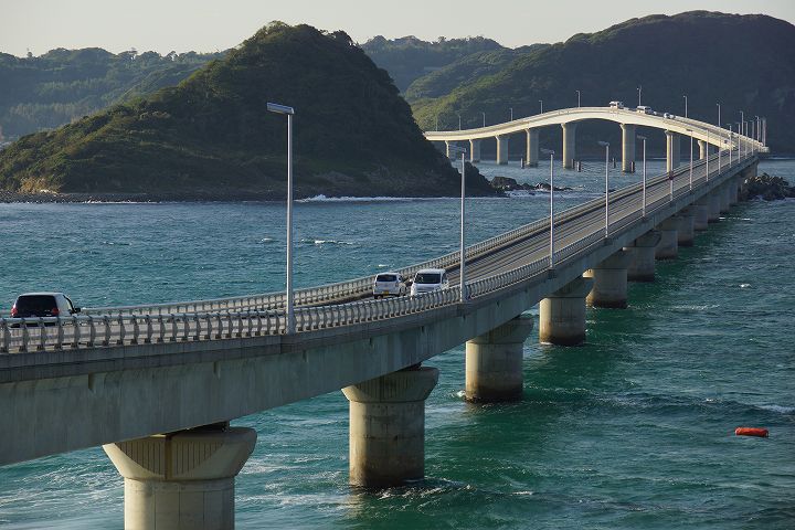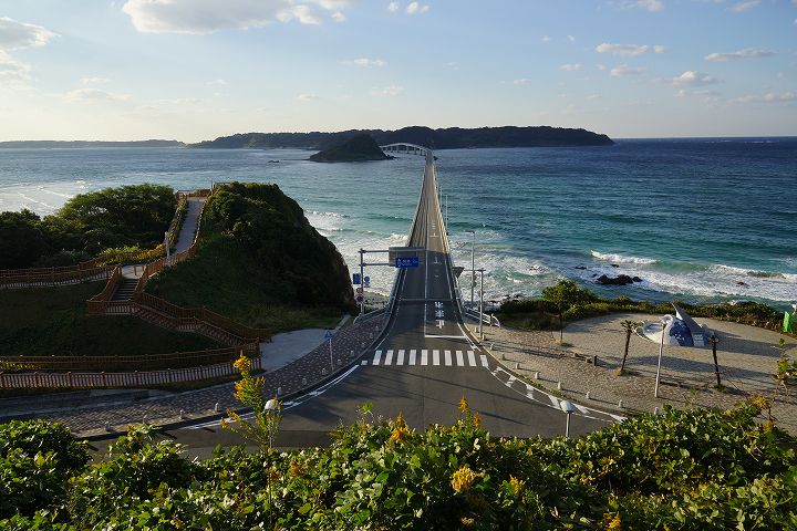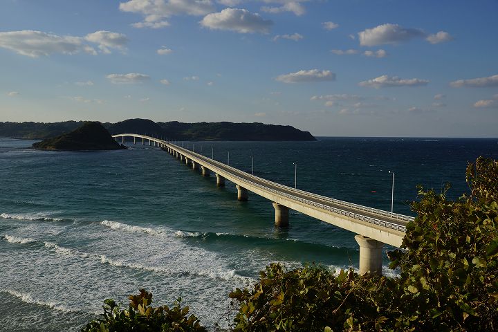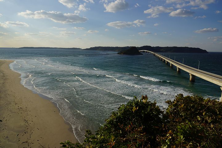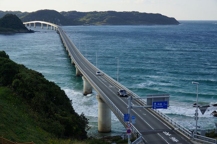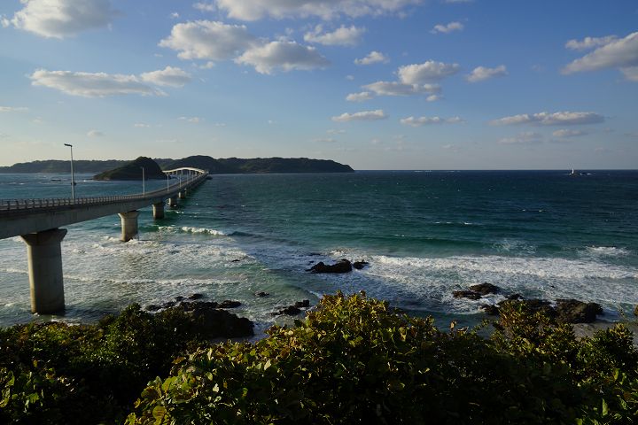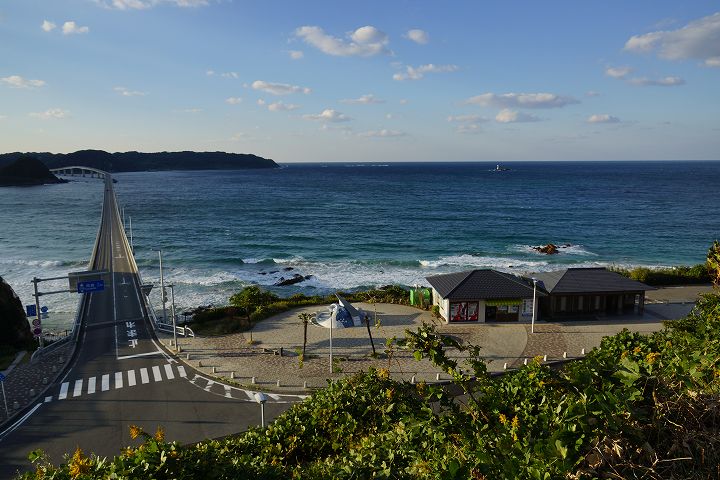 | 角島大橋の風景 Part1(本州側から) (2012年11月1日撮影) SLT-A77V 下関から約50qもの道のりを経てようやく角島大橋に到着しました。 角島大橋は2000年11月3日に開通して以来、山口県を代表する観光名所となっており、自動車のCM撮影などで登場しています。角島大橋は全長1,780mで、無料で通行できる橋としては日本第2位の長さを誇ります。 角島大橋の長い橋脚とエメラルドグリーンの海の風景がとても素晴らしいです!! 角島大橋を見渡せる高台から ![]() エメラルド色の海を渡る角島大橋 ![]() 角島大橋入口付近は海士ケ瀬公園 ![]() ![]() 展望台 ![]() 橋のふもとには休憩所・駐車場もあります ![]() 海士ヶ瀬公園モニュメント ![]() 何とも言えないくらい絶景です ![]() すぐ下の海士ヶ瀬公園駐車場方面へ下ります ![]() 海士ヶ瀬公園駐車場へ到着 ![]() 角島大橋前の海士ヶ瀬公園広場と展望台 ![]() 海士ヶ瀬公園モニュメント ![]() ![]() 中央部を拡大すると・・・何だこれ?w ![]() ![]() 長〜い橋です 一直線だけなく途中で緩やかに曲がってるのがいいですね。 ![]() ![]() ![]() ![]() ![]() ![]() 道路挟んで展望台へ ![]() ![]() ![]() ここから展望台からの風景 ![]() ![]() ![]() ![]() ![]() 白い砂浜、青い海に架かる角島大橋 ![]() ![]() 中央部左下付近にはホテル西長門リゾートがあります ![]() ![]() いよいよ角島大橋を渡って角島へ! ![]() NEXT