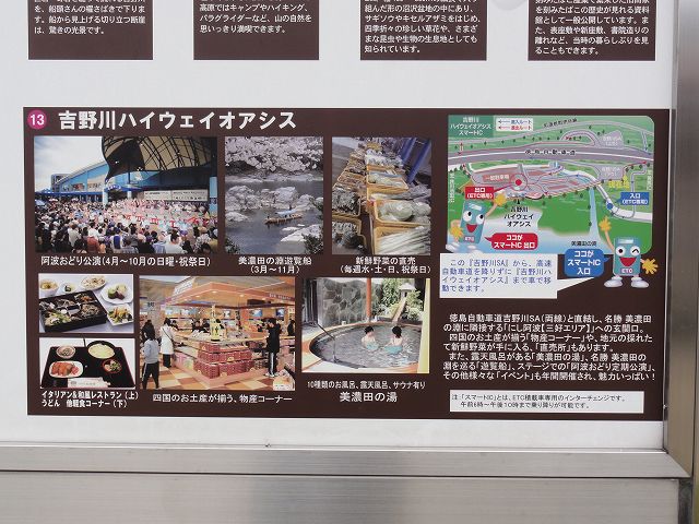 吉野川サービスエリアは徳島県西部の徳島道沿いにあります。ハイウェイオアシスが併設されており、露天風呂がある温泉「美濃田の湯」や名勝美濃田の淵を巡る遊覧船が運行されたり、阿波おどりの定期公演などイベントも数多く開催されるなど、西阿波地区観光の玄関口となっています。